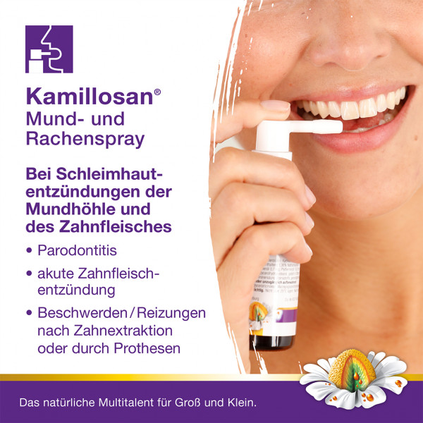 Kamillosan Mund- und Rachenspray ist ein pflanzliches Arzneimittel. Es ist ein Spray zur Anwendung in der Mundhöhle. Kamillosan Mund- und Rachenspray wird angewendet bei Rachenentzündungen (Tonsillopharyngitis) bei nicht fieberhaften Erkältungskrankheiten und bei Schleimhautentzündungen der Mundhöhle und des Zahnfleisches.