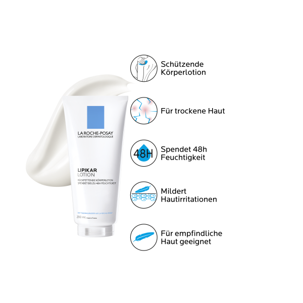 Die Pflege für die ganze Familie: LIPIKAR LOTION mit regenerierendem Thermalwasser aus La Roche-Posay. Durch ihre spezielle Formel schützt die LIPIKAR LOTION empfindliche und trockene Haut vor dem Austrocknen und spendet bis zu 48 Stunden Feuchtigkeit. Da die Formulierung nur ein Minimum an ausgewählten Inhaltsstoffen beinhaltet, ist sie auch bei sehr empfindlicher Haut gut verträglich. Die cocoonartige Textur der Cold Cream schützt vor dem Austrocknen. Niacinamid mildert Hautirritationen und das Spannungsgefühl der Haut, während Sheabutter rückfettend wirkt und die Haut geschmeidig hält. Die dezent duftende und schnell einziehende Textur der LIPIKAR LOTION fettet und klebt nicht.
