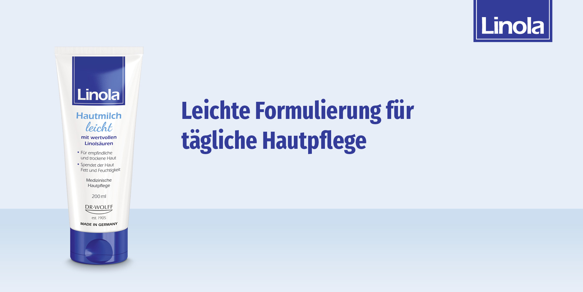 Die Linola Hautmilch leicht wurde für die tägliche Hautpflege von trockener und empfindlicher Haut entwickelt. Sie kann auch als begleitende Basispflege der Haut, z. B. bei Neigung zu Neurodermitis im Sommer, eingesetzt werden. Natürlich kann Linola Hautmilch auch in der Schwangerschaft und Stillzeit sowie schon bei Kindern ab 3 Jahren angewendet werden.