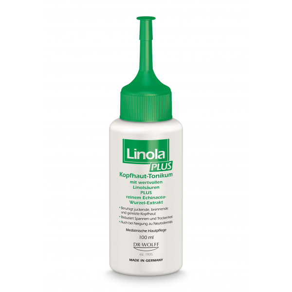 Linola PLUS Kopfhaut-Tonikum ist abgestimmt auf die speziellen Pflege-Bedürfnisse juckender, brennender, gereizter sowie zu Neurodermitis neigender Kopfhaut. Es reduziert den Juckreiz, das Brennen sowie das Spannungsgefühl auf der Kopfhaut. Linola PLUS Kopfhaut-Tonikum kann täglich angewendet werden. Je nach Ausprägung des Juckreizes kann es sowohl am ganzen Kopf oder auf einzelnen, von Juckreiz besonders betroffenen Stellen aufgetragen werden. Dank eines Applikators lässt sich das Kopfhaut-Tonikum leicht auftragen und verteilen. Linola PLUS Kopfhaut-Tonikum zeichnet sich durch seine einzigartige Formulierung aus wertvollem Linolsäure-reichen Distelöl sowie einem besonderen Pflanzenextrakt aus der Wurzel der Echinacea purpurea (Purpur-Sonnenhut) aus.
