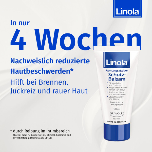 - Bei Inkontinenz und Blasenschwäche sollten die betroffenen Hautpartien nach der Reinigung oder dem Waschen großflächig dünn eingecremt werden, eine mehrmalige Anwendung empfehlenswert. Ähnliches gilt für Hautreizungen infolge von Menstruation. Natürlich kann der Linola Schutz-Balsam auch in der Schwangerschaft und Stillzeit angewendet werden.