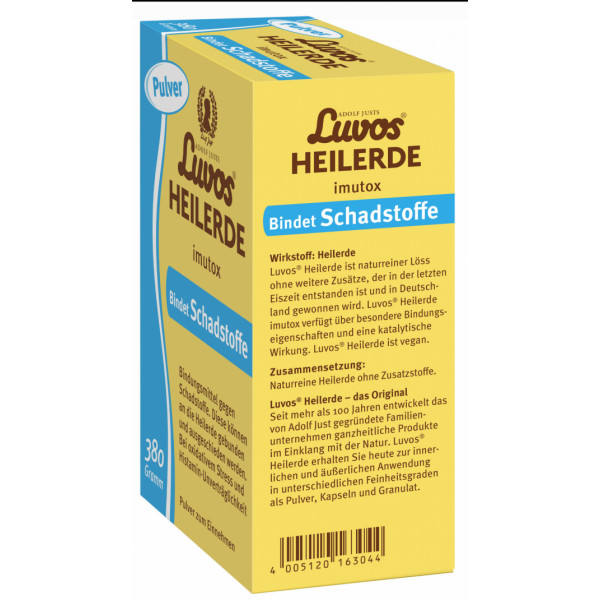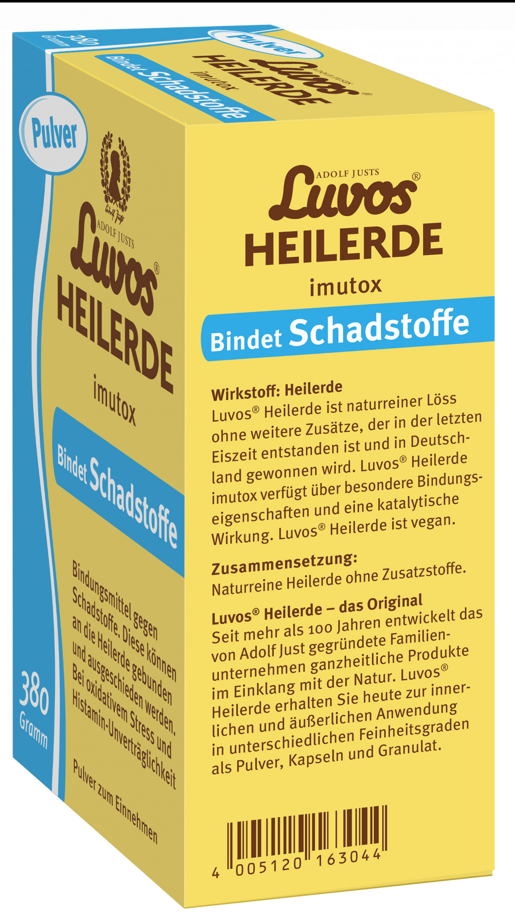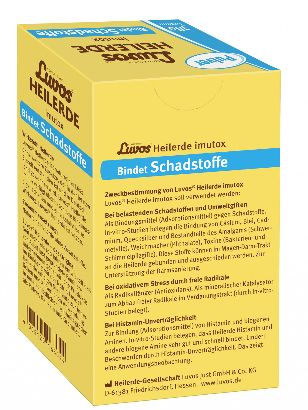 Adolf Justs Luvos® Heilerde imutox Pulver ist ein Medizinprodukt, das zur Unterstützung des Organismus bei der Körperentgiftung, Darmsanierung, Entschlackung sowie Entlastung der Leber und Niere durch Bindung von Schadstoffen und Umweltgiften aus der Nahrung verwendet wird. Beispielsweise werden gebunden:  belastende Substanzen (radioaktives Cäsium), Schwermetalle (Blei, Cadmium, Quecksilber und Bestandteile des Amalgams), Weichmacher (Phthalate), Toxine (Bakterien- und Schimmelpilzgifte).