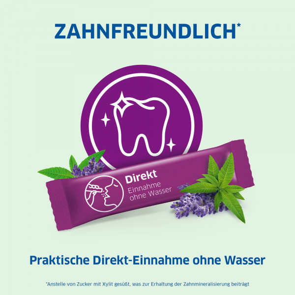 Die Sticks schmecken angenehm nach Zitronenverbene und Lavendel und lösen sich direkt im Mund. Sie sind zuckerfreiund können dadurch auch nach dem Zähneputzen eingenommen werden. Außerdem sind sie anstelle von Zucker mit Xylit gesüßt, was zur Erhaltung der Zahnmineralisierung beiträgt. Xylit kann von den Säure produzierenden Bakterien in der Mundhöhle nicht verwertet werden.