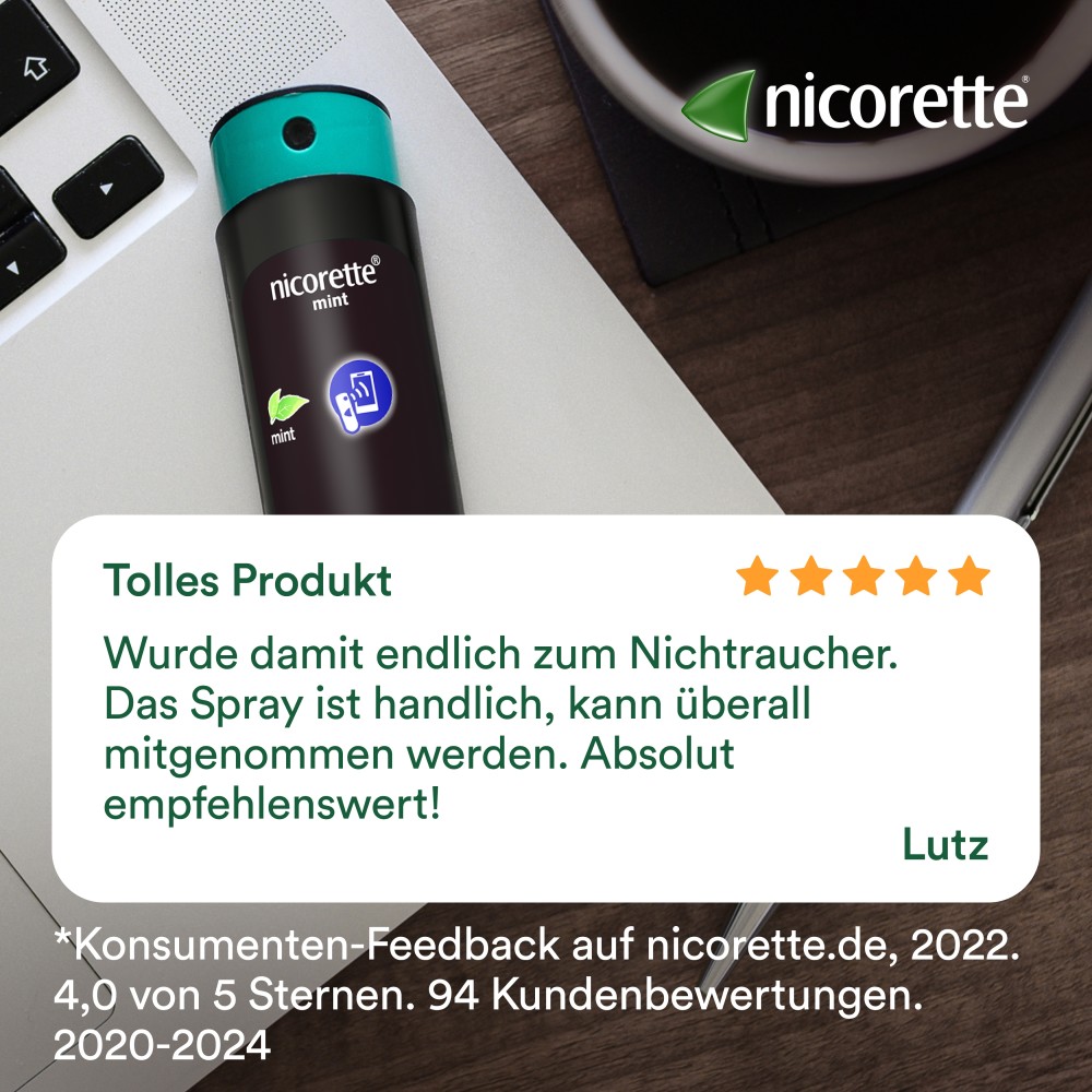 - Rauchen aufhören: nicorette® fruit & mint Spray lindert Rauchverlangen in nur 30 Sekunden mit zwei Sprühstößen, klinisch belegt! Jetzt mit motivierender Tracking-App „nicorette® Nichtraucher“ verbinden.
