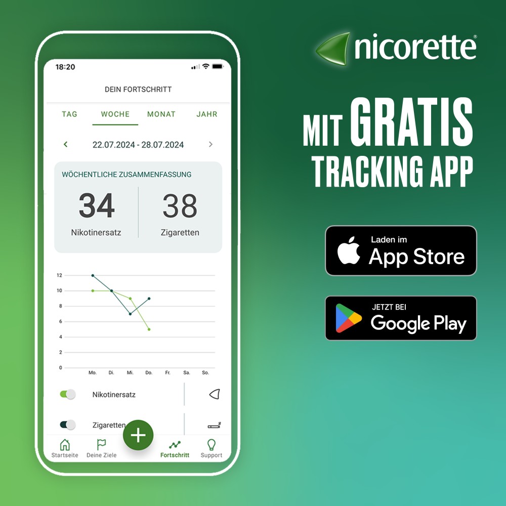 - nicorette® Spray – jetzt mit Tracking-App „nicorette® Nichtraucher“ verbinden: trackt die Nutzung des Sprays und damit das Erreichen der selbst gesetzten Rauchstopp-Ziele