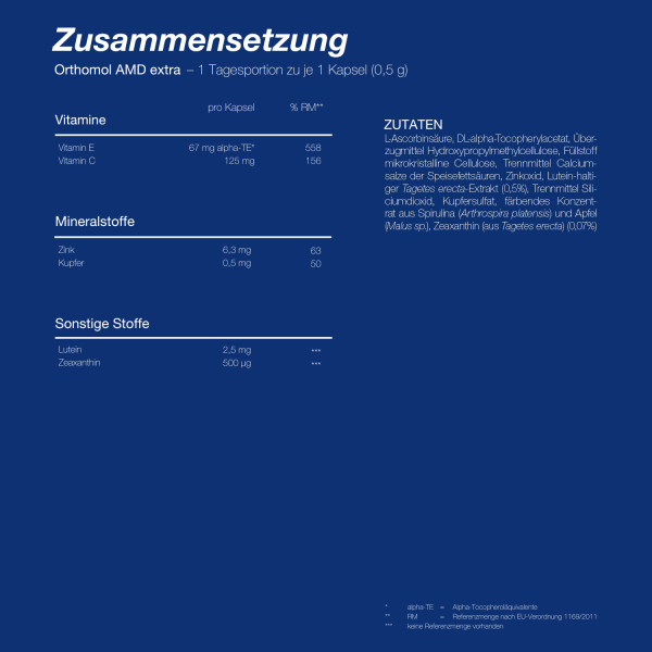 Orthomol AMD extra ist ein Nahrungsergänzungsmittel mit Vitamin E, Vitamin C, Zink, Kupfer, Lutein und Zeaxanthin. Zink trägt zur Erhaltung normaler Sehkraft bei. Vitamin C und Kupfer tragen zu einer normalen Funktion des Nervensystems (u.a. Sehnerv) bei. Vitamin C, Vitamin E, Kupfer und Zink tragen zum Schutz der Zellen vor oxidativem Stress bei.