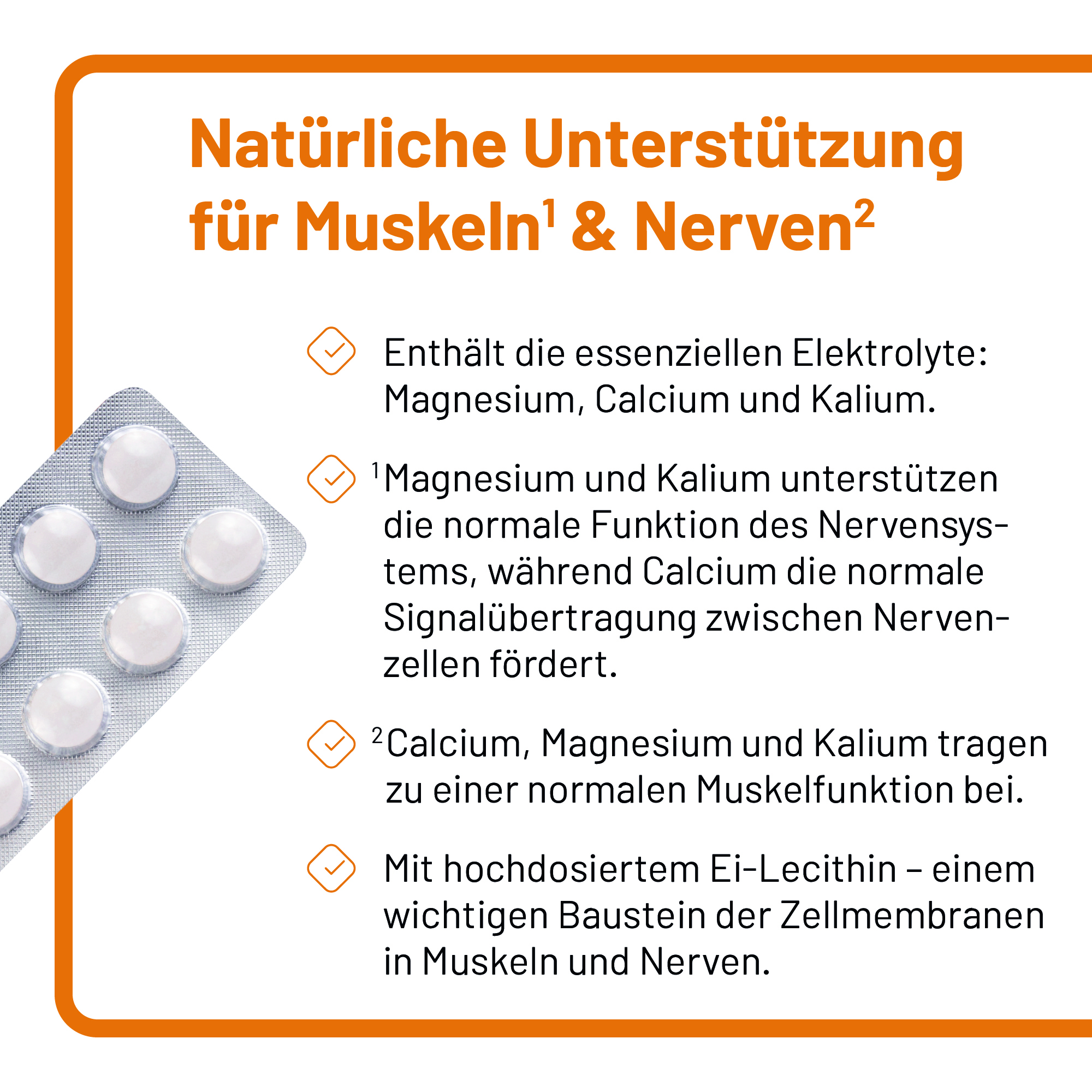 Die Inhaltsstoffe von Phosetamin NE, der speziellen Kombination aus Elektrolyten und Ei-Lecithin, leisten einen effektiven und wertvollen Beitrag zur Gesundheit der Nerven und zu einer gesunden Muskelfunktion.