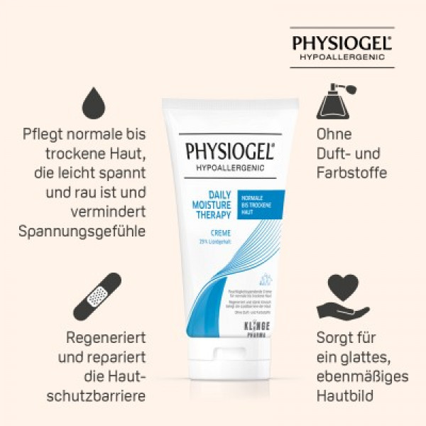 Die Creme spendet Feuchtigkeit, regeneriert und repariert die Haut und schützt vor wiederkehrender Trockenheit. Sie ist hautverträglich, klinisch getestet und frei von Duft- und Farbstoffen. Dank der innovativen BioMimetic Technologie der PHYSIOGEL Daily Moisture Therapy Creme wird die gestörte Hautbarriere aufgrund ihrer einzigartigen Zusammensetzung nach dem Vorbild gesunder, widerstandsfähiger Haut repariert und regeneriert.