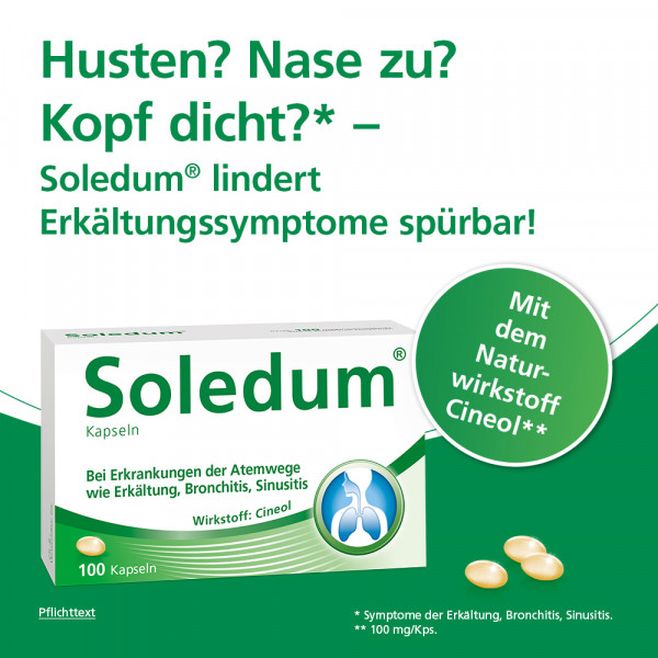 Soledum Kapseln sind ein entzündungshemmendes und schleimlösendes Arzneimittel zur Zusatzbehandlung bei Erkrankungen der Atemwege. Zur Behandlung der Symptome bei Bronchitis und Erkältungskrankheiten der Atemwege, zur Zusatzbehandlung bei chronischen und entzündlichen Erkrankungen der Atemwege (z.B. der Nasennebenhöhlen).