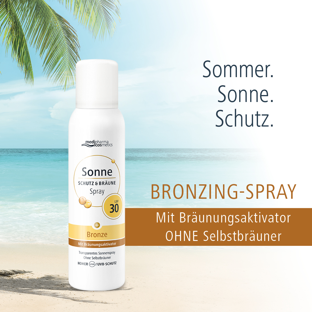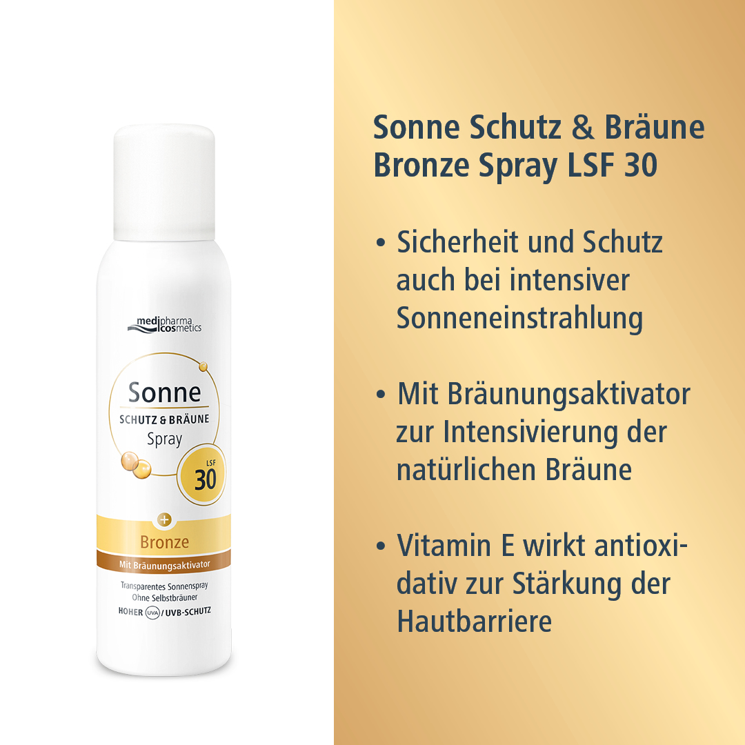 Das ultraleichte und transparente Sonnenspray Schutz & Bräune mit LSF 30 von medipharma cosmetics ist für Gesicht und Körper geeignet und bietet Sicherheit und Hautschutz auch bei intensiver Sonneneinstrahlung. Die leichte Textur zieht schnell ein, klebt und fettet nicht und ist wasserfest. Der enthaltene Pro-Melanin-Extrakt unterstützt die Melanin-Produktion und verstärkt so die natürliche Bräune ganze ohne Selbstbräuner. Vitamin E wirkt antioxidativ zur Stärkung der Hautbarriere.
