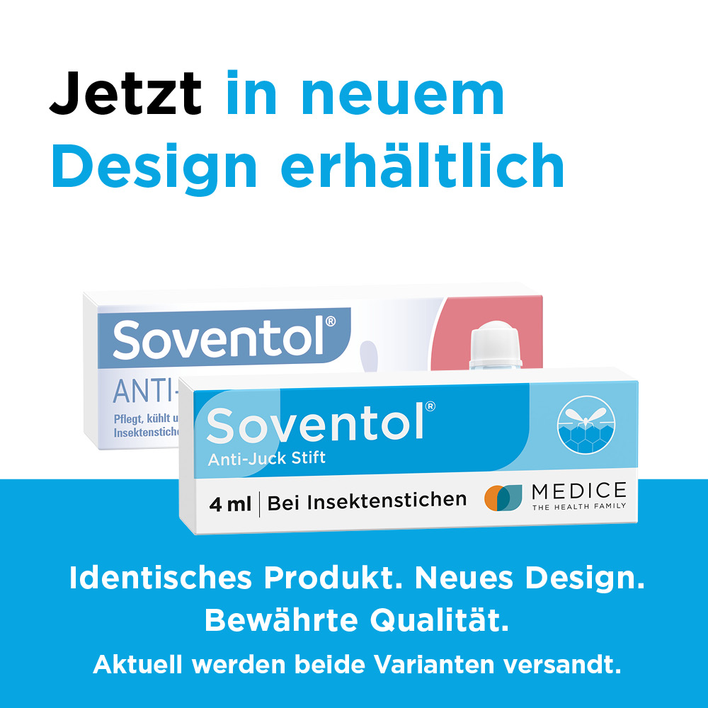 Bei Mückenstichen hilft der Soventol® Anti-Juck Stift: Er kühlt wunderbar und pflegt sanft. Praktisch: Der Roll-On Stift ist klein, auslauf- und bruchsicher und passt in jede Handtasche ? der ideale Begleiter für unterwegs! Ebenfalls von Vorteil: Der Soventol® Anti-Juck Stift ist sehr gut verträglich und damit für die ganze Familie geeignet.