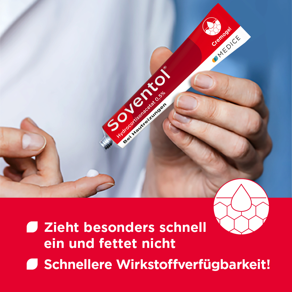 Soventol® HydroCortisonACETAT 0,5% überzeugt zudem durch eine innovative Galenik: Die Cremogel-Formulierung wurde eigens von Hautärzten entwickelt. Das Cremogel kühlt wie ein Gel und pflegt wie eine Creme.