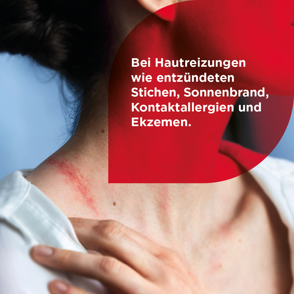 - Geeignet bei akuten und besonders ausgeprägten Haut-Irritationen (z. B. bei gereizter Sommerhaut wie Sonnenbrand, Sonnenallergie, Mallorca-Akne sowie bei entzündeten Insektenstichen und starkem Juckreiz)