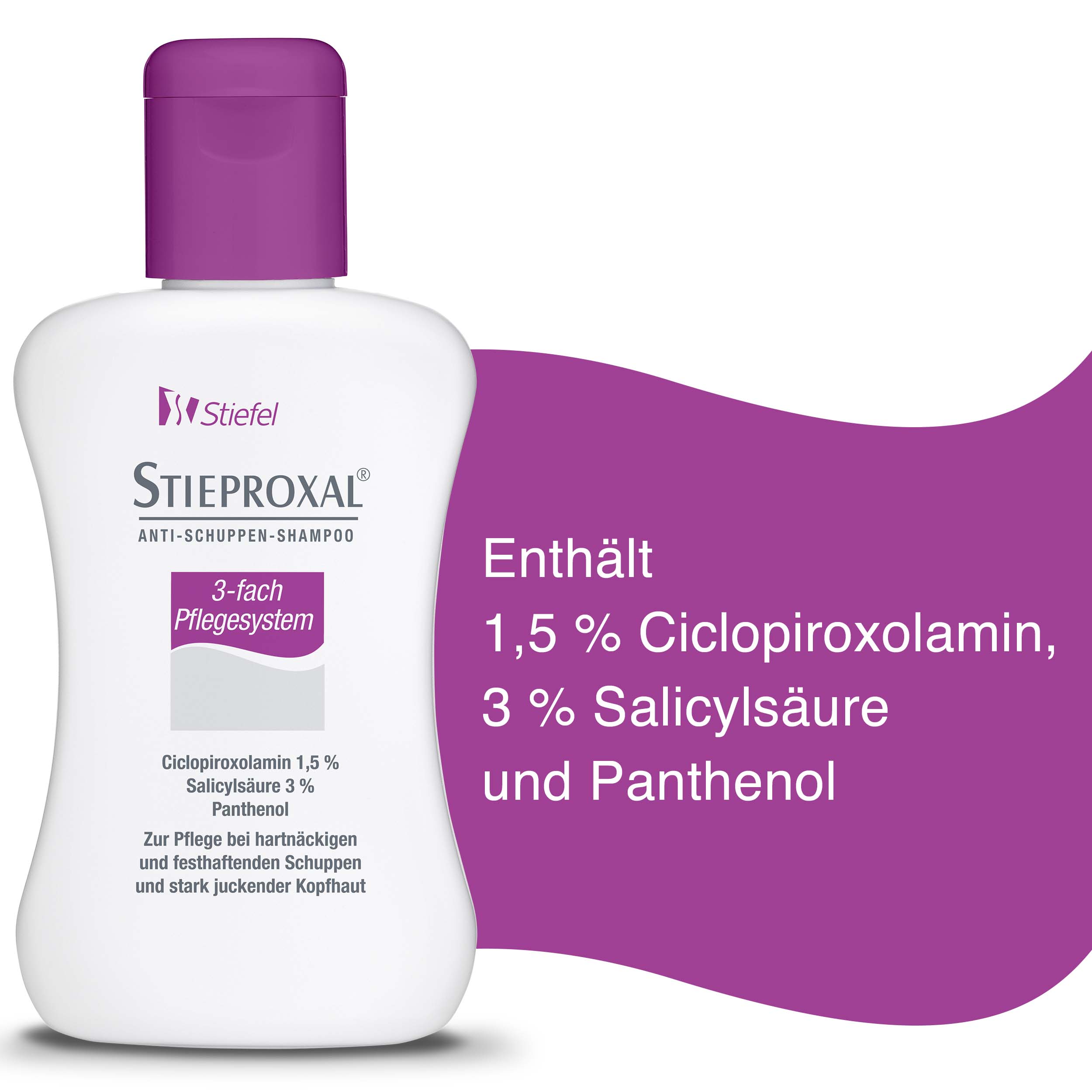 STIEPROXAL verbindet die belegte Anti-Schuppen-Wirksamkeit von Ciclopiroxolamin mit den schuppenlösenden Eigenschaften der Salicylsäure. STIEPROXAL mit dem 3-fach Anti-Schuppen-Pflegesystem. Anti-Schuppen-Wirkstoff Ciclopiroxolamin bekämpft gezielt die Ursachen der Schuppen. Salicylsäure löst die hartnäckigen und festhaftenden Schuppen. Panthenol pflegt und sorgt für die Regeneration der Kopfhaut. Das Haar wird leichter kämmbar und bekommt Glanz und Geschmeidigkeit zurück. Ergebnis: Die Kopfhaut kann ihr natürliches Gleichgewicht zurückerhalten.