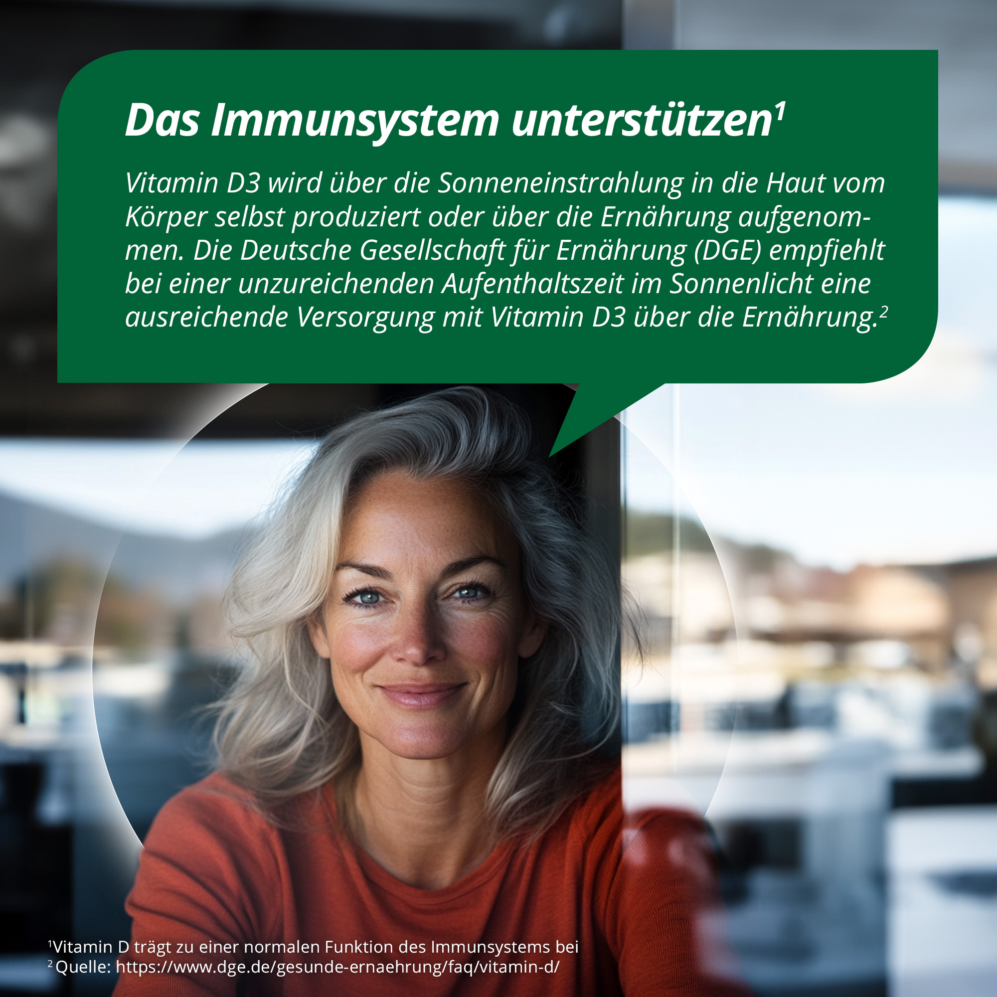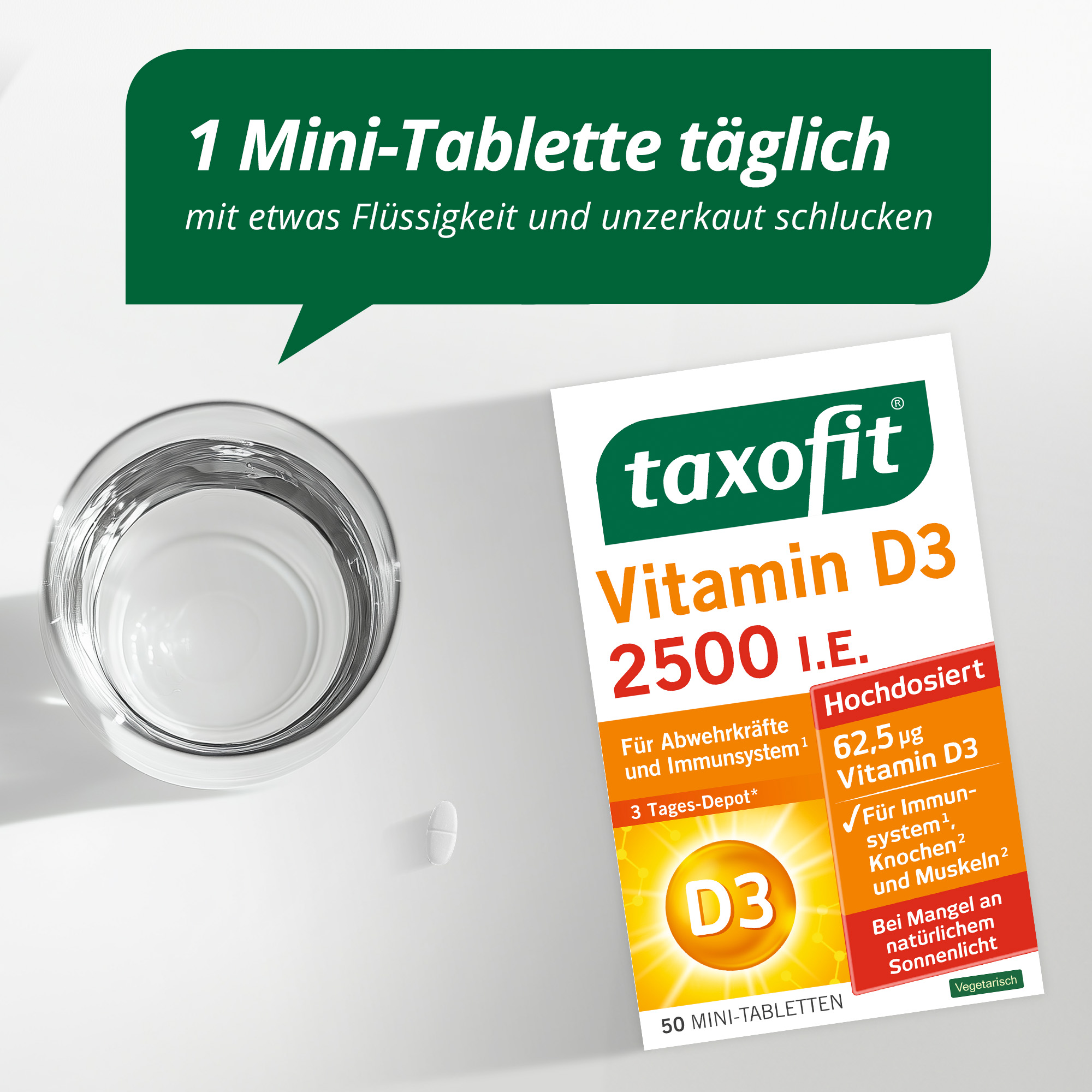 Vitamin D3 wird über die Sonneneinstrahlung in die Haut vom Körper selbst produziert oder über die Ernährung aufgenommen. Die Deutsche Gesellschaft für Ernährung (DGE) empfiehlt bei einer unzureichenden Aufenthaltszeit im Sonnenlicht eine ausreichende Versorgung mit Vitamin D3 über die Ernährung. Wenn im Falle einer unausgewogenen Ernährung die empfohlene Tageszufuhr jedoch nicht erreicht wird, bietet sich eine Nahrungsergänzung mit Vitamin D3 an. taxofit® Vitamin D3 2500 I.E. versorgt den Körper mit hochdosiertem Vitamin D3 natürlichen Ursprungs - für Knochen, Zähne und Muskeln sowie ein funktionierendes Immunsystem.