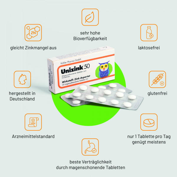 Unizink 50 ist ein Mineralstoffpräparat zur Zufuhr (Substitution) von Zink bei Zinkmangel.