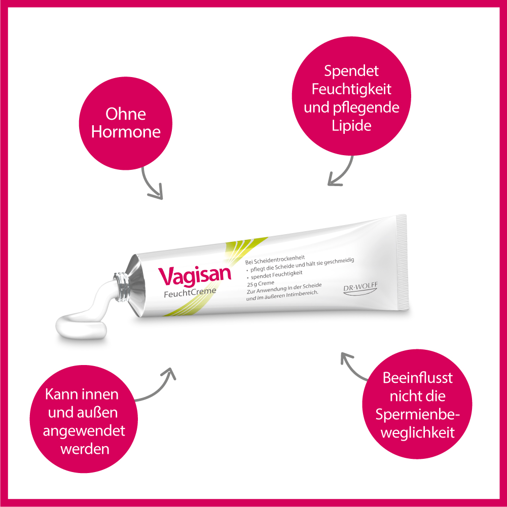 Vagisan FeuchtCreme kann vor dem Intimverkehr angewendet werden (als Gleitcreme), insbesondere bei Schmerzen beim Geschlechtsverkehr. Die Intimcreme beeinflusst nicht die Spermienbeweglichkeit und kann somit auch bei Kinderwunsch angewendet werden.