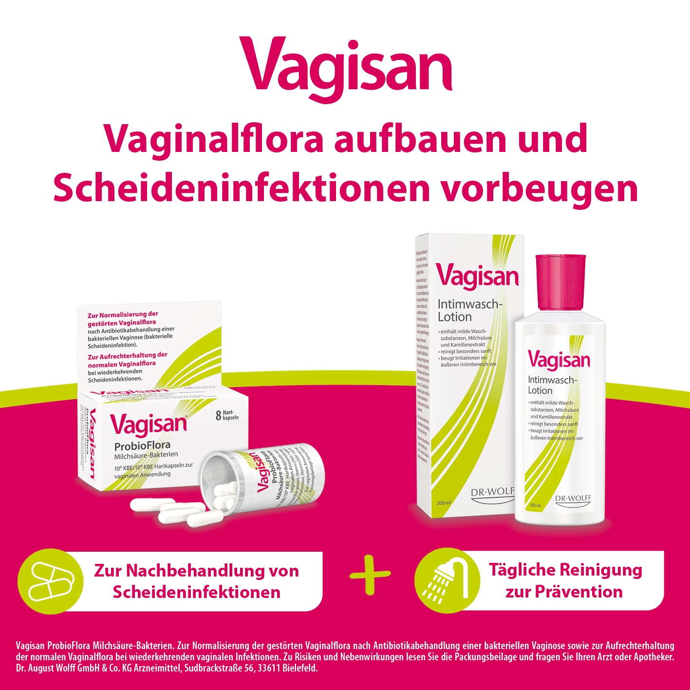 Vagisan Intimwaschlotion ist eine besonders sanfte Waschlotion für den äußeren Intimbereich. Der natürliche Säureschutzmantel bleibt durch die milden Inhaltsstoffe bei der Intimreinigung erhalten, und die empfindliche Haut im Intimbereich wird geschont, ein wertvoller Beitrag für eine gesunde Intimhygiene. Zusätzlich beruhigt der in der Waschlotion enthaltene Kamillenextrakt während der Reinigung im Intimbereich die empfindliche Haut. Vagisan Intimwaschlotion ist sehr gut verträglich und eignet sich auch bei trockener Haut für die tägliche Anwendung. Herkömmliche Dusch- und Badepräparate können stark entfettende und hautreizende Waschsubstanzen enthalten. Deshalb ist die Verwendung von speziellen Produkten im Rahmen der Intimhygiene (z. B. Intimlotion zum Waschen) sinnvoll. Bei falscher oder übertriebener Intimhygiene kann es zu Juckreiz, Hautreizungen oder sogar Infektionen durch krankmachende Pilze und Bakterien kommen, wenn der Säureschutzmantel und damit die natürliche Schutzfunktion nachhaltig gestört wird. Frauen können aus den unterschiedlichsten Gründen unter Trockenheit, Juckreiz und Brennen im Intimbereich leiden, zum Beispiel aufgrund hormoneller Veränderungen in den Wechseljahren, in der Schwangerschaft oder in der Stillzeit, durch Stress oder aber auch durch Diabetes. Falsche Intimpflege und Intimreinigung können die Symptome verstärken. Eine sanfte tägliche Intimhygiene, die nicht austrocknet und auf den natürlichen pH-Wert des Intimbereichs abgestimmt ist, ist dann besonders wichtig. Die Waschlotion von Vagisan ist sehr gut verträglich und deshalb - auch bei trockener Haut - für die tägliche Reinigung im Intimbereich geeignet.