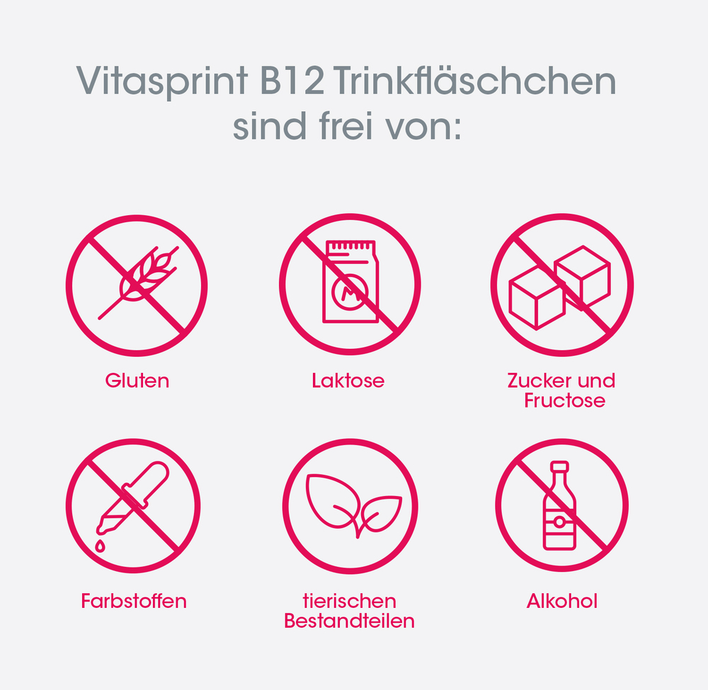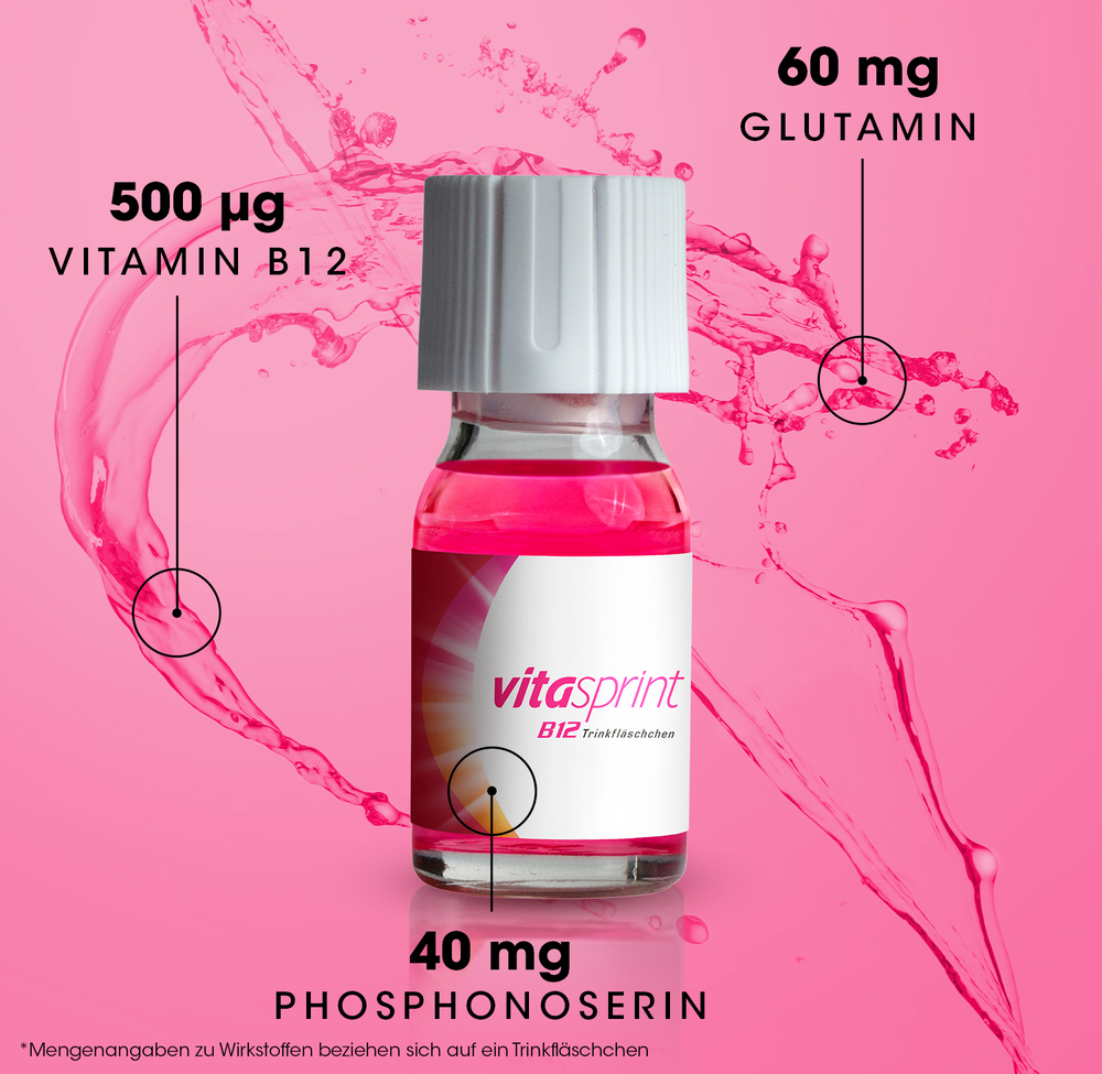 Vitasprint B12 Trinkfläschchen Wirkstoff: Cyanocobalamin (Vitamin B12), (RS)-2-Amino-3-(phosphonooxy)propansäure (DL-Phosphonoserin), Glutamin. Anwendungsgebiete: Traditionell angewendet zur Besserung des Allgemeinbefindens. Warnhinweis: Enthält Sorbitol. Freiverkäuflich. Stand: 12/2020. Zu Risiken und Nebenwirkungen lesen Sie die Packungsbeilage und fragen Sie Ihren Arzt oder Apotheker.