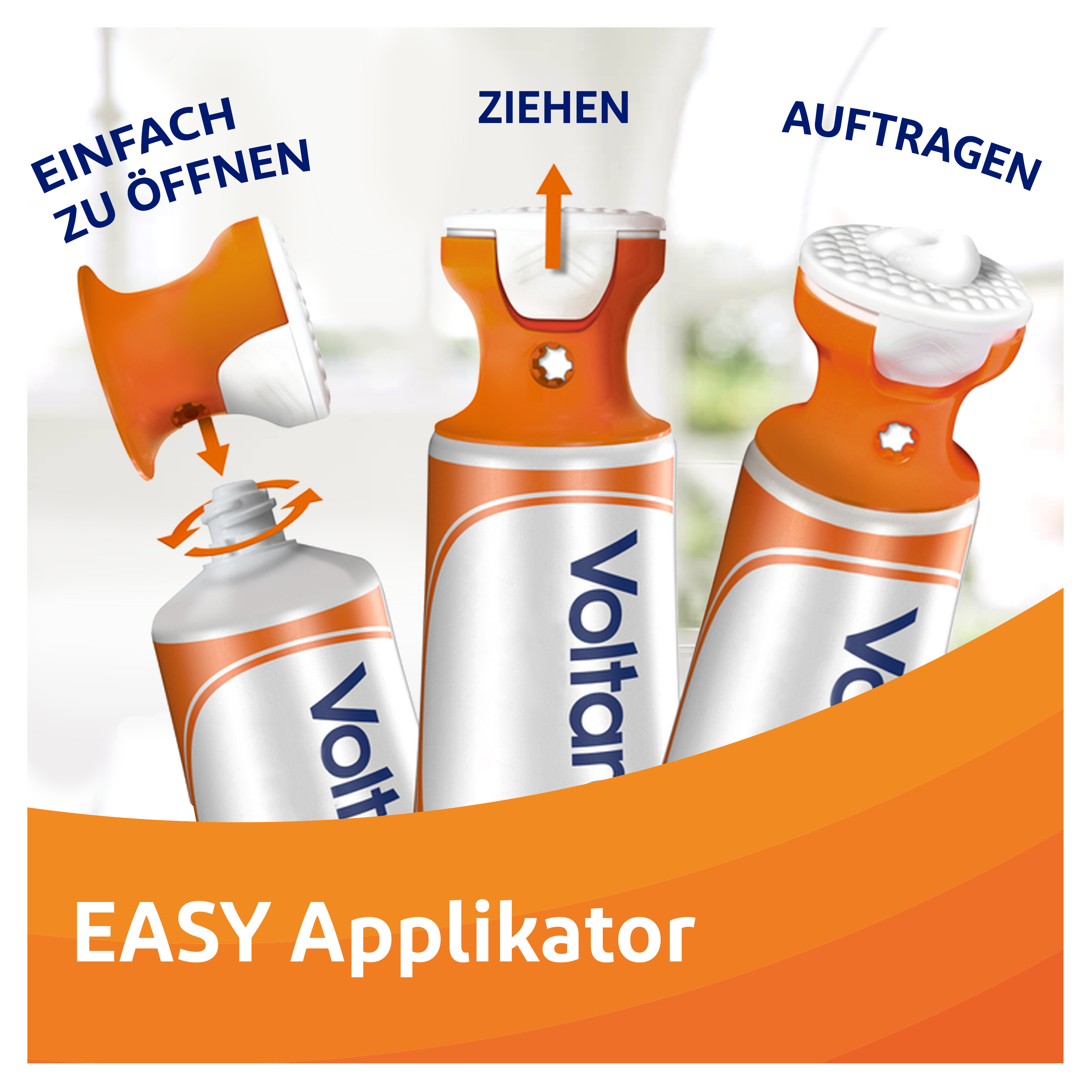 Voltaren Schmerzgel 11,6 mg/g Gel mit EASY-Applikator Wirkstoff: Diclofenac-N-Ethylethanamin. Anwendungsgebiete: Erwachsene: Zur symptomatischen Behandlung von Schmerzen bei akuten Zerrungen, Verstauchungen oder Prellungen in Folge stumpfer Traumen, z.B. Sport- und Unfallverletzungen; Schmerzen der gelenknahen Weichteile (z.B. Schleimbeutel, Sehnen, Sehnenscheiden, Bänder, Muskelansätze und Gelenkkapseln) bei Arthrose der Knie- und Fingergelenke; bei Epicondylitis; bei akuten Muskelschmerzen z. B. im Rückenbereich. Jugendliche über 14 Jahren: Zur Kurzzeitbehandlung; zur lokalen, symptomatischen Behandlung von Schmerzen bei akuten Prellungen, Zerrungen oder Verstauchungen infolge eines stumpfen Traumas. Warnhinweis: Enthält Propylenglycol und einen Duftstoff mit Benzylbenzoat. Apothekenpflichtig. Stand: 11/2018. Zu Risiken und Nebenwirkungen lesen Sie die Packungsbeilage und fragen Sie Ihren Arzt oder Apotheker.