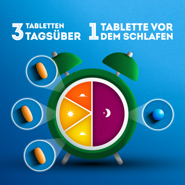 • Für einen erholsameren Schlaf lindert die blaue Tablette Erkältungssymptome in der Nacht