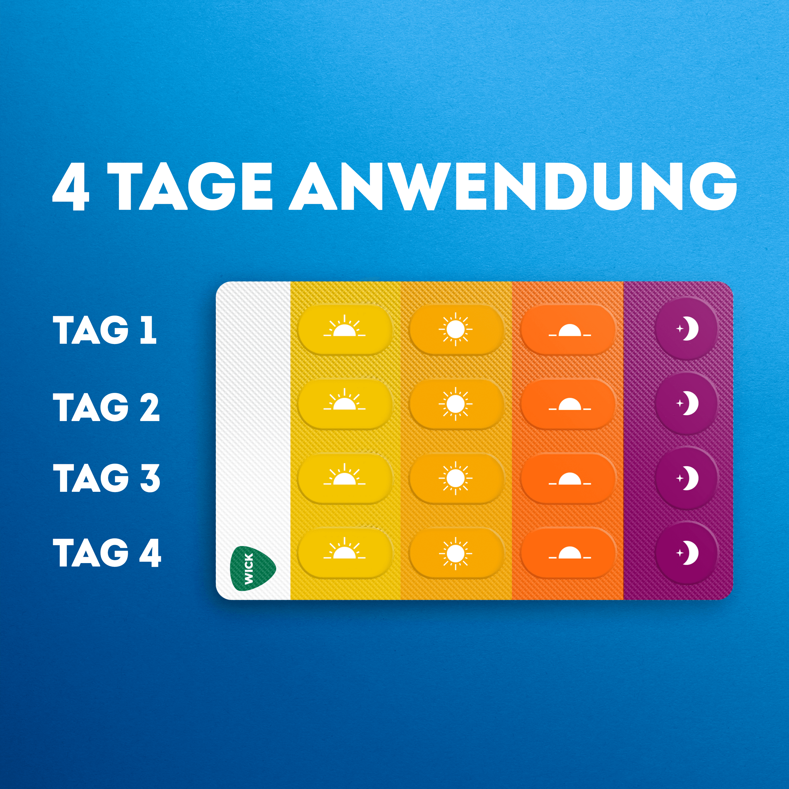 Eine Erkältung stellt das Leben auf den Kopf - wenn wir erkältet sind, fühlen wir uns tagsüber oft völlig erschöpft, können aber nachts nicht schlafen. WICK DayNait hilft Ihnen, Symptome zu lindern und dadurch den Tag zu meistern und nachts zu schlafen. Das Erkältungsmittel lindert Erkältungssymptome am Tag und in der Nacht und hilft gegen Fieber, Kopfschmerzen, Gliederschmerzen, Halsschmerzen, verstopfte Nase und laufende Nase/Niesen. Der praktische, selbsterklärende Blister enthält pro Tag drei spezielle gelbe Tabletten für den Tag und eine spezielle blaue Tablette für die Nacht. So können Sie Ihren Tag aktiver gestalten und in der Nacht besser schlafen. WICK DayNait ist zudem vegan, laktosefrei, glutenfrei und zuckerfrei.